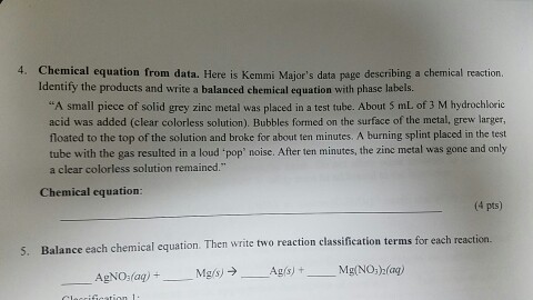 SOLVED:16. Write a balanced equation (including phase labels) for the ... we are just looking to balance some chemical equations. So the first one we have a gcl in the solid state. I won't list. I went right down the states but I will say them aloud just to save a bit of times what a gcl solid at two and H. Three A quits. That gives us A G. And H. 32 plus acquis Art C. L minus liquids. The next example we've got C R E N two cl two cl acquits R two H 20.