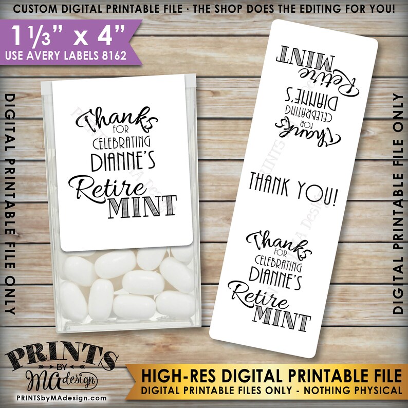 Retirement Party Tic Tac Labels, Custom Retire MINT Stickers, Mints ... Retirement Party Tic Tac Labels, Custom Retire MINT Stickers, Mints, PRINTABLE 1.5" Square Avery #22805 Labels, Print As Many As You Need $7.00 Shipping to United States : Free Add to cart Ask a question Details Shipping & Policies Custom Retirement Party Tic Tac® labels - Customized by the shop with the Retiree's name!