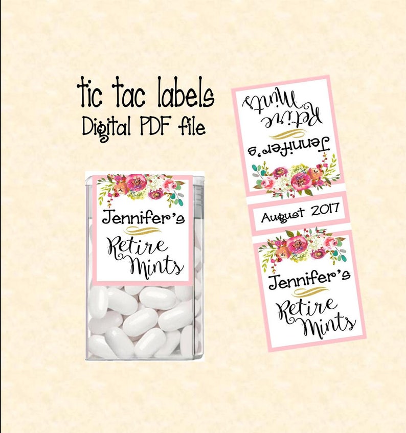 Retirement Tic Tac | Etsy Retirement Tic Tac Label (Sheet of 10)- LABEL ONLY - Retire MINT - Funny retirement gift - Happy Retirement SmileAlwaysDesigns 5 out of 5 stars (26) $ 5.01. Add to Favorites Retirement Party Tic Tac Labels, Custom Retire MINT Stickers, Tic Tacs Labels, Mints, 1-1/3x4" PRINTABLE Stickers, Print As Many As You Need ... Retirement favor, tic tac labels, retire mint stickers labels ... Retirement favor, tic tac labels, retire mint stickers labels customized (set of 24 printed labels) TIC78900 tic tac labels You can change the line color and heart color PLEASE READ ALL INFORMATION ABOUT THIS LISTING Fits the 1 oz size tic tacs \"ONLY\" Label measures 1.5 x 4 and has rounded corners.