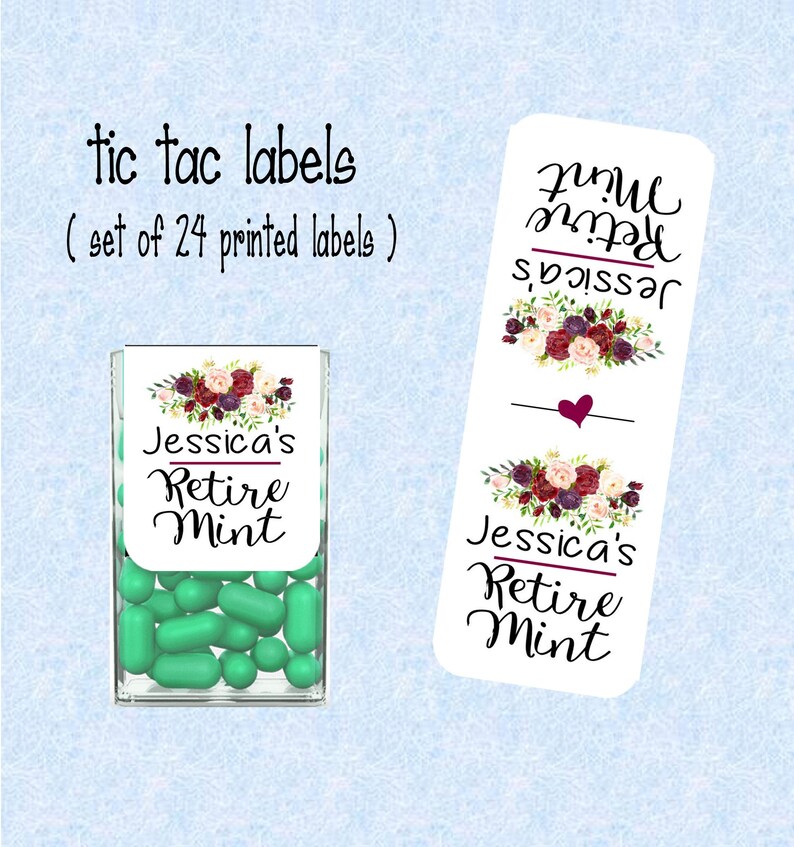 Retirement Party Tic Tac Labels Custom Retire MINT Stickers - Etsy Retirement Party Tic Tac Labels, Custom Retire MINT Stickers, Tic Tacs Labels, Mints, 1-1/3x4" PRINTABLE Stickers, Print As Many As You Need $7.00 In stock Add your personalization Provide customization info here. Only what is offered to be customized will be modified. Custom digital order will be uploaded to your account Mon-Fri 9-11am EST.