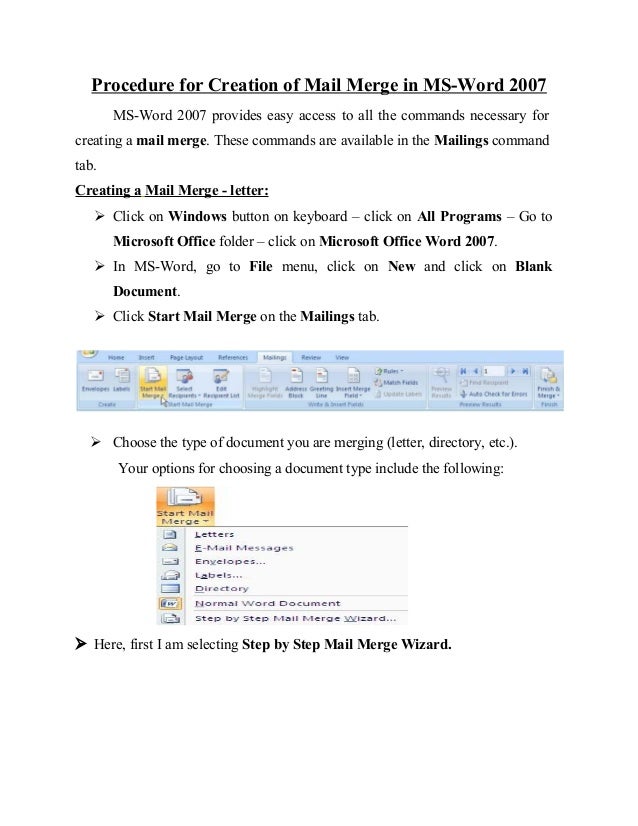 Word 2007: Using Mail Merge - GCFGlobal.org To use Mail Merge: Select the Mailings on the Ribbon. Select the Start Mail Merge command. Select Step by Step Mail Merge Wizard. The Mail Merge task pane appears and will guide you through the six main steps to complete a merge. You will have several decisions to make during the process. The following is an example of how to create a form ...