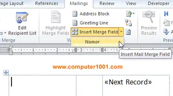 Cara Membuat Mail Merge Label Diurutkan Memkolom Salin ( CTRL + C) tulisan Next Record pada baris 2 tabel dan tempatkan ( CTRL + V) ke baris berikutnya hingga terisi semuanya. Tampilan label mail merge dengan semua Next Record. Lanjutkan dengan mengisi data (merge field) pada label yang lain. Caranya: pada Mailings tab, grup Write & Insert Fields, klik Update Labels.